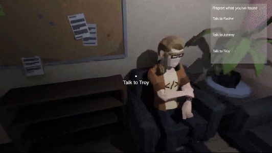 In addition to having a detection system, we also needed a way to provide an interactive dialogue that held multiple options for the players to choose from. I created a simple one that worked with Ink. Ink was perfect for this as it allowed the entire team, not just me as a developer, to create and edit the narrative. With Ink being integrated, I had to create a way to store variables between individual dialogue instances. I did this by storing it into a "story".